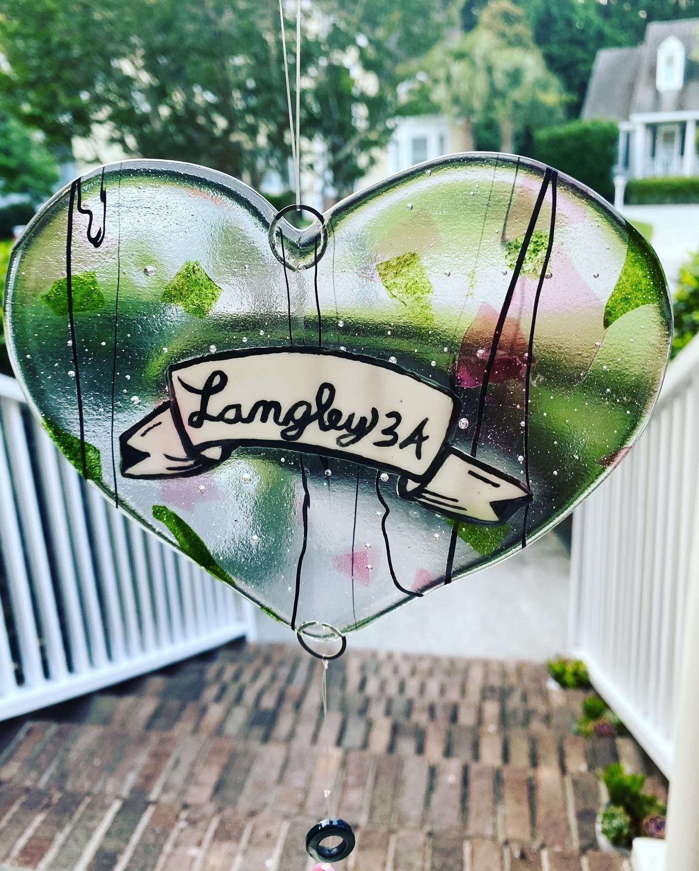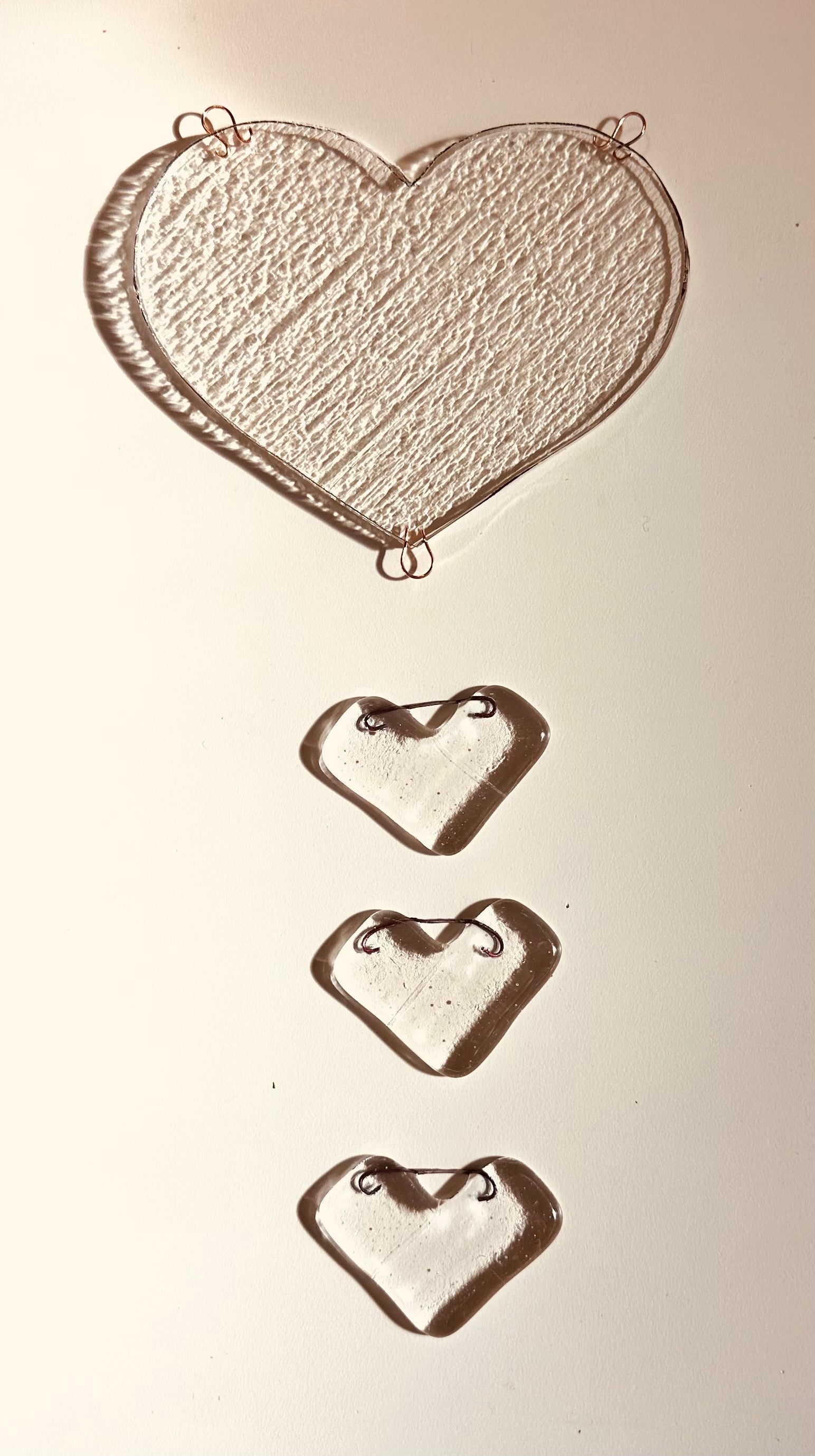 You will learn some basic skills in fused glass, to design this 4-piece sun catcher. Large pre-fused clear heart 5.5” and three 2” small pre-fused small hearts. We will be using real and dried flowers along with glass powder frit, glass baubles, glass stringers, glass mosaic chips, or enamel paint.
