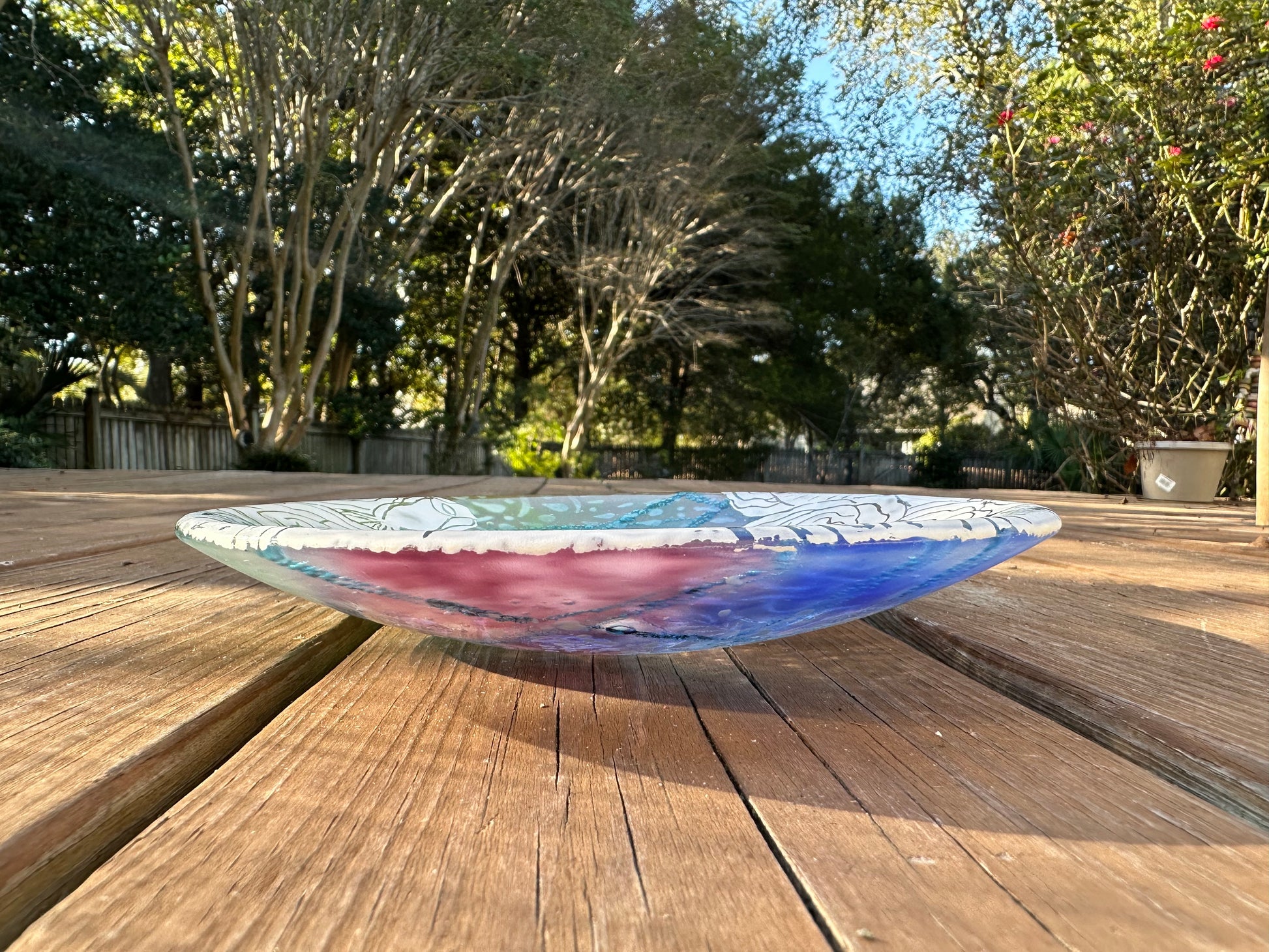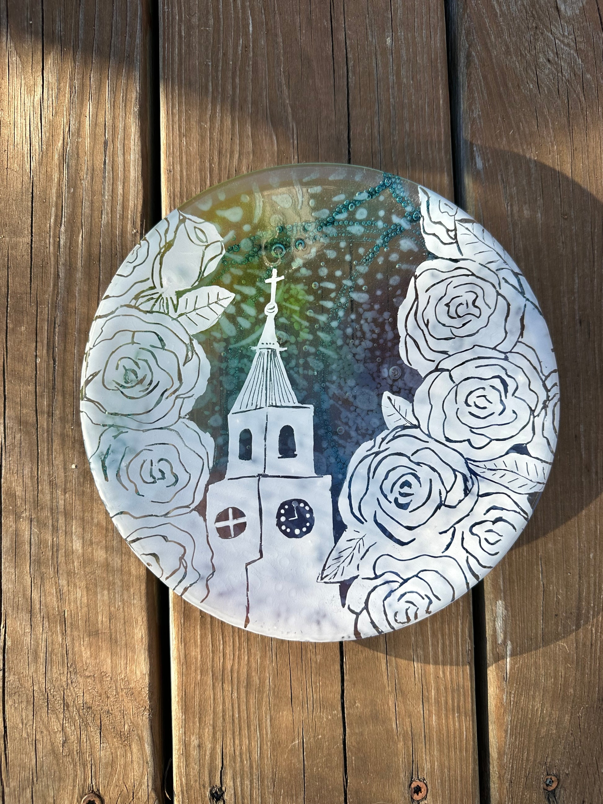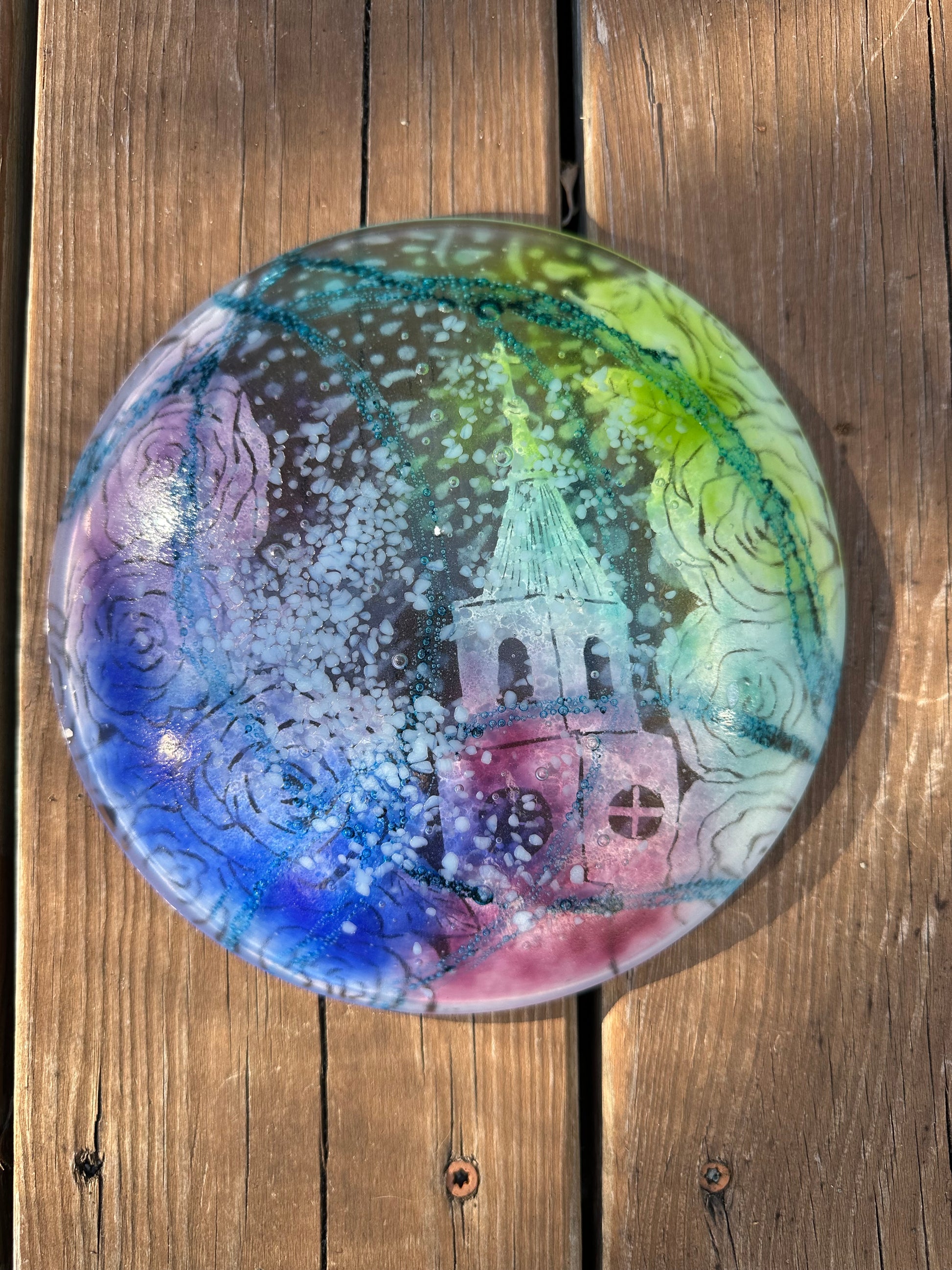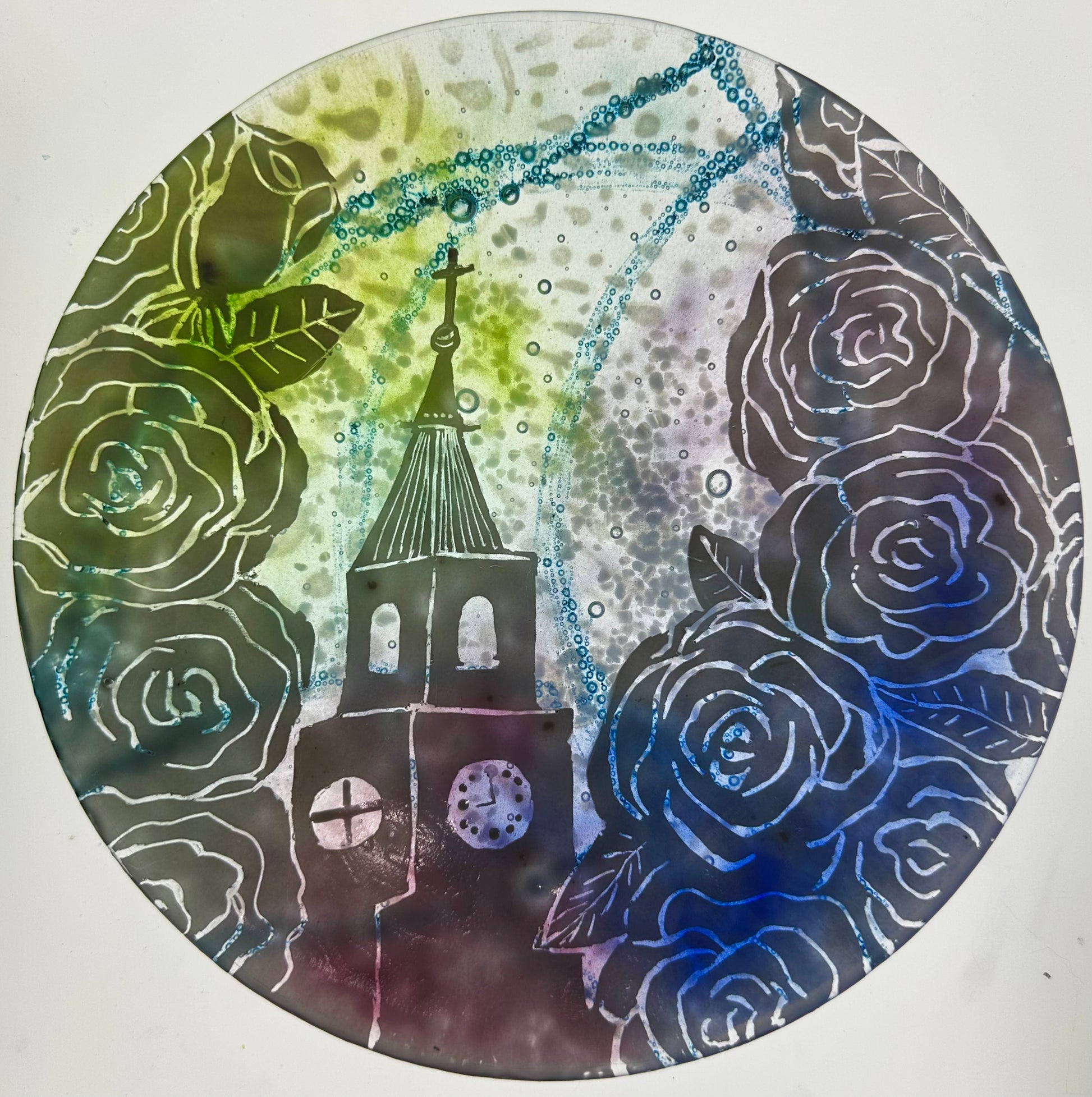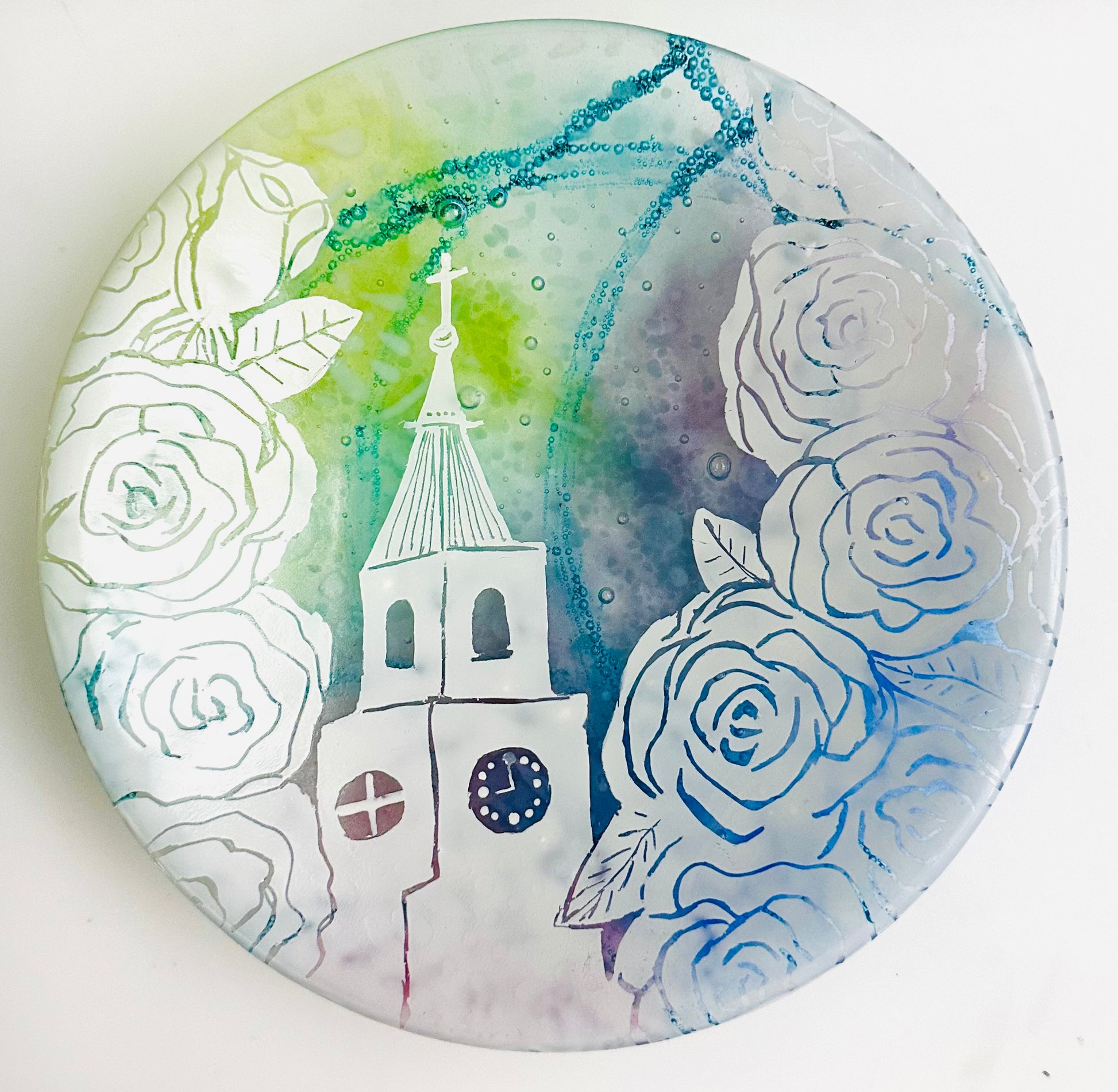 This piece was inspired by walking down Church Street in Charleston. The unique colors were hand powdered. The streaks of blue were hand painted with copper carbonate. Finally, the flowers and church were etched from fusible enamel paint. It was slumped into a low profile bowl.