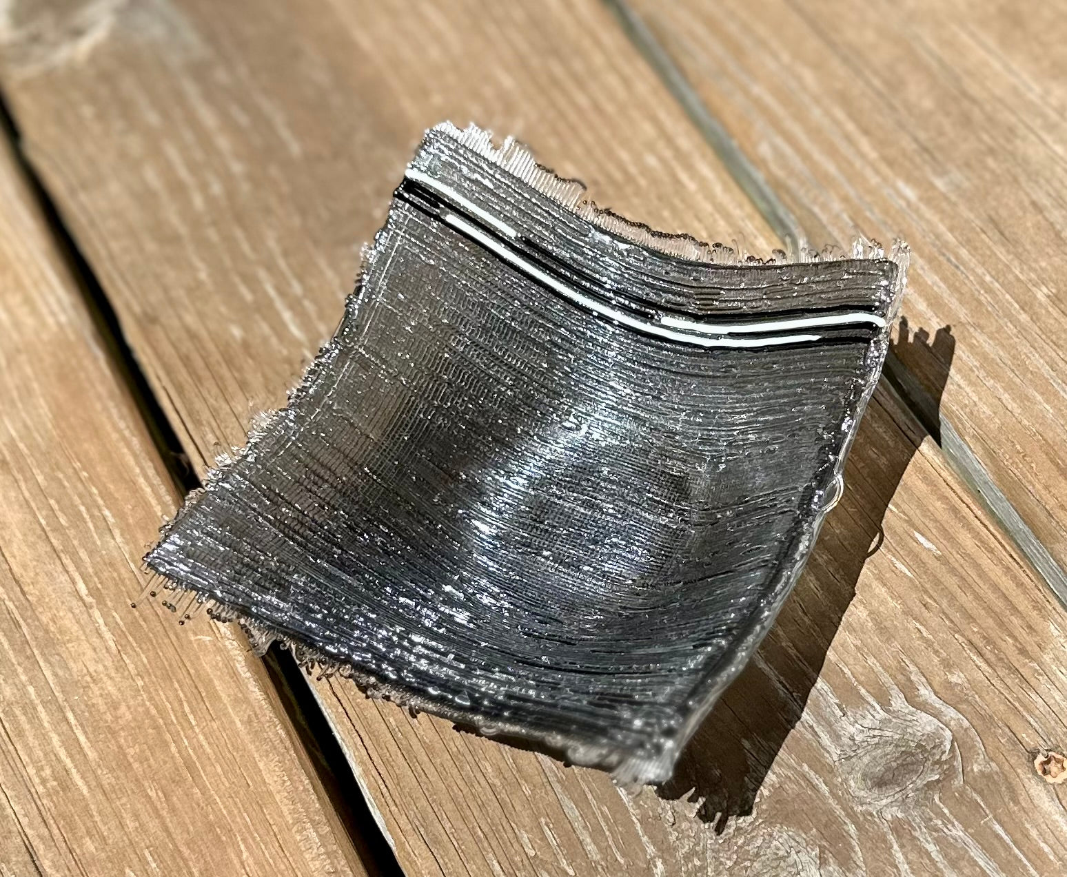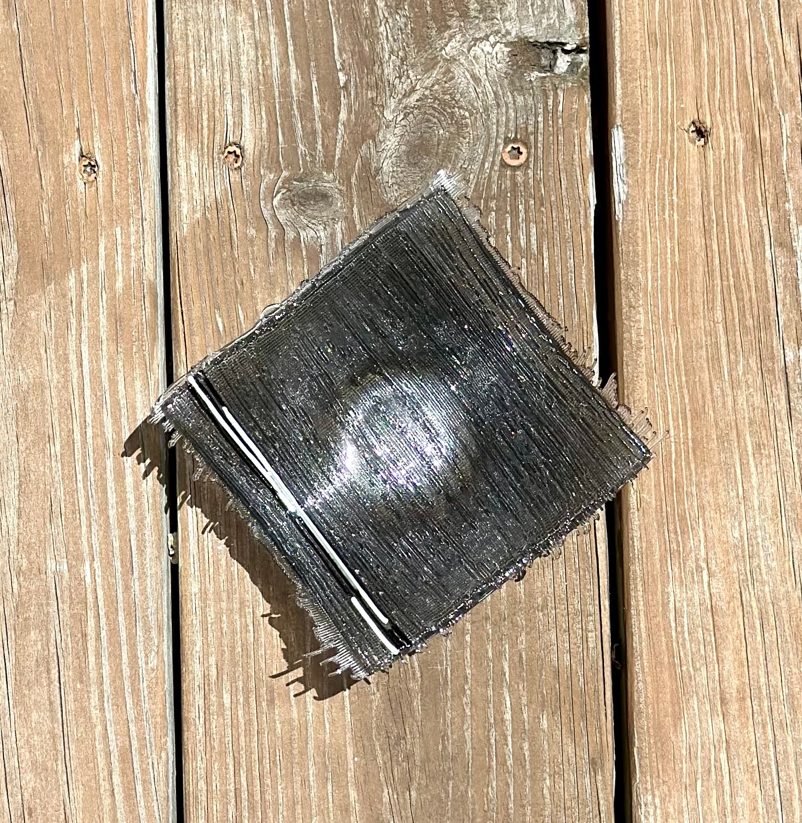 This small dish gets tons of second looks and pets. It’s made with 250 1mm glass strings called stingers in my very own pattern. It features silver grey, opaque white, black, and clear. This small dish looks like woven material frozen in time.